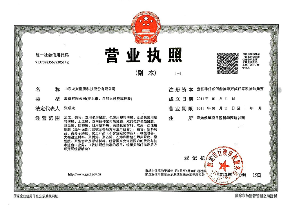 山東龍興塑膜科技股份有限公司前身為山東壽光龍興農(nóng)膜有限公司組建于2011年,2018年10月重組,目前是壽光市國有控股公司、高新技術(shù)企業(yè),是專業(yè)生產(chǎn)高檔農(nóng)用薄膜、工業(yè)用薄膜的企業(yè),是一家以產(chǎn)品制造為主,集科研開發(fā)、產(chǎn)品設(shè)計(jì)、技術(shù)服務(wù)于一體的綜合性企業(yè)。公司現(xiàn)有職工228人,各類工程技術(shù)人員97人,管理人員20余人,注冊(cè)資金14234.2096萬元,總資產(chǎn)102314萬元,目前是壽光市國有控股公司、高新技術(shù)企業(yè)。公司是中國塑料加工工業(yè)協(xié)會(huì)農(nóng)膜專業(yè)委員會(huì)會(huì)員單位,中國復(fù)合材料工業(yè)協(xié)會(huì)會(huì)員單位,中國塑料加工工業(yè)協(xié)會(huì)雙向拉伸聚酯薄膜專業(yè)委員會(huì)會(huì)員單位...